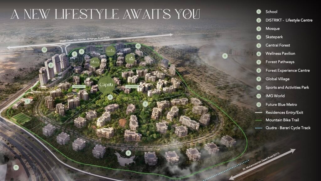 Auch in Bezug auf die Lage überzeugt Capria auf ganzer Linie. Trotz der naturnahen Atmosphäre ist man hervorragend angebunden: Nur etwa 15 bis 20 Minuten sind es zur Mall of the Emirates, zur Palm Jumeirah, zum Dubai International Airport oder zur Dubai Marina. Das macht Capria ideal für alle, die ein ruhiges, gesundes und naturverbundenes Zuhause suchen, ohne auf die Nähe zur Stadt verzichten zu wollen.