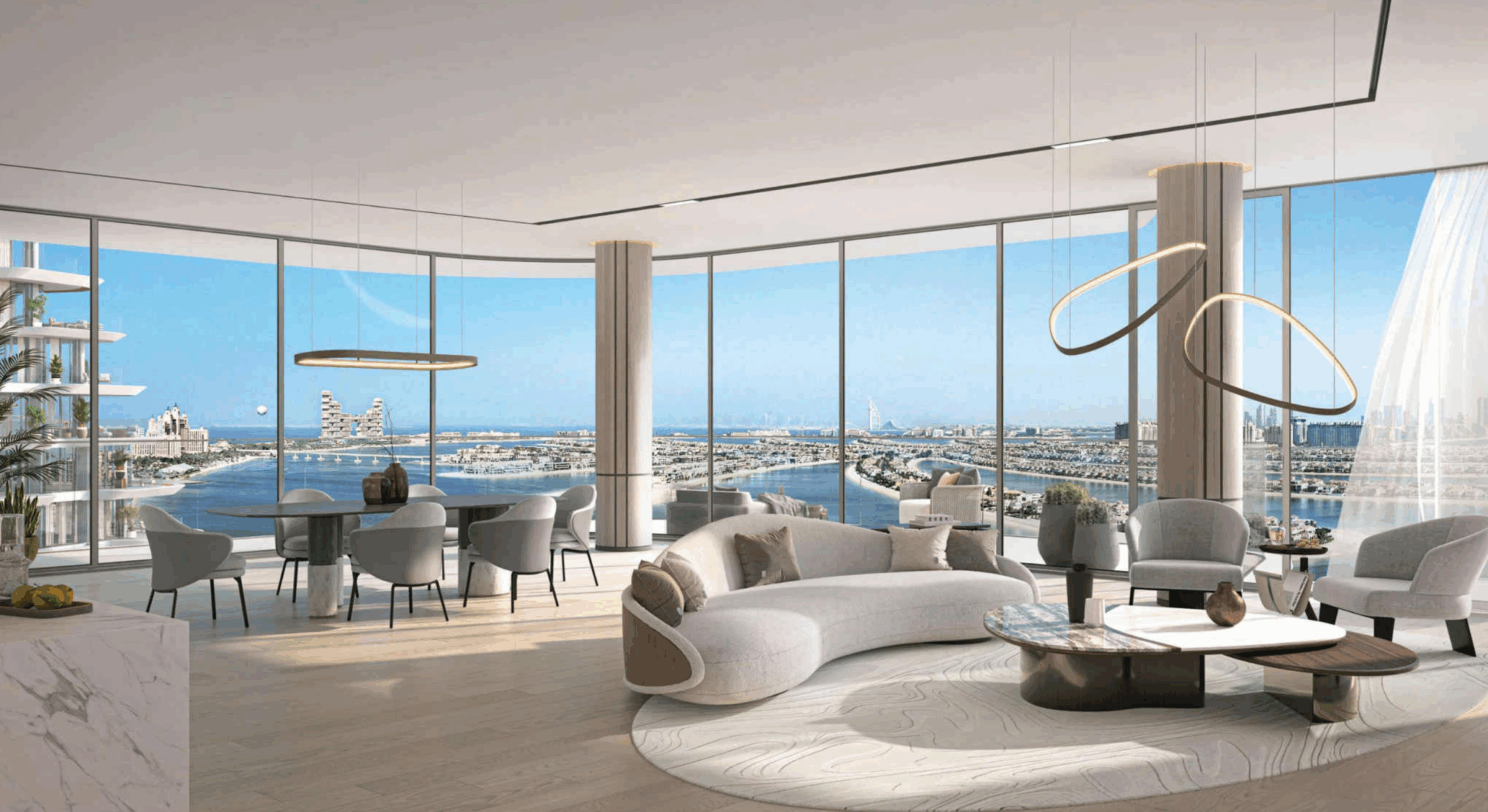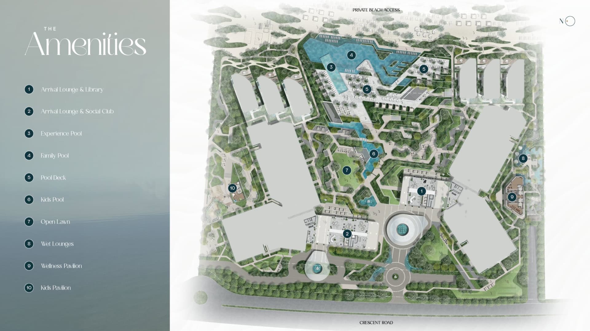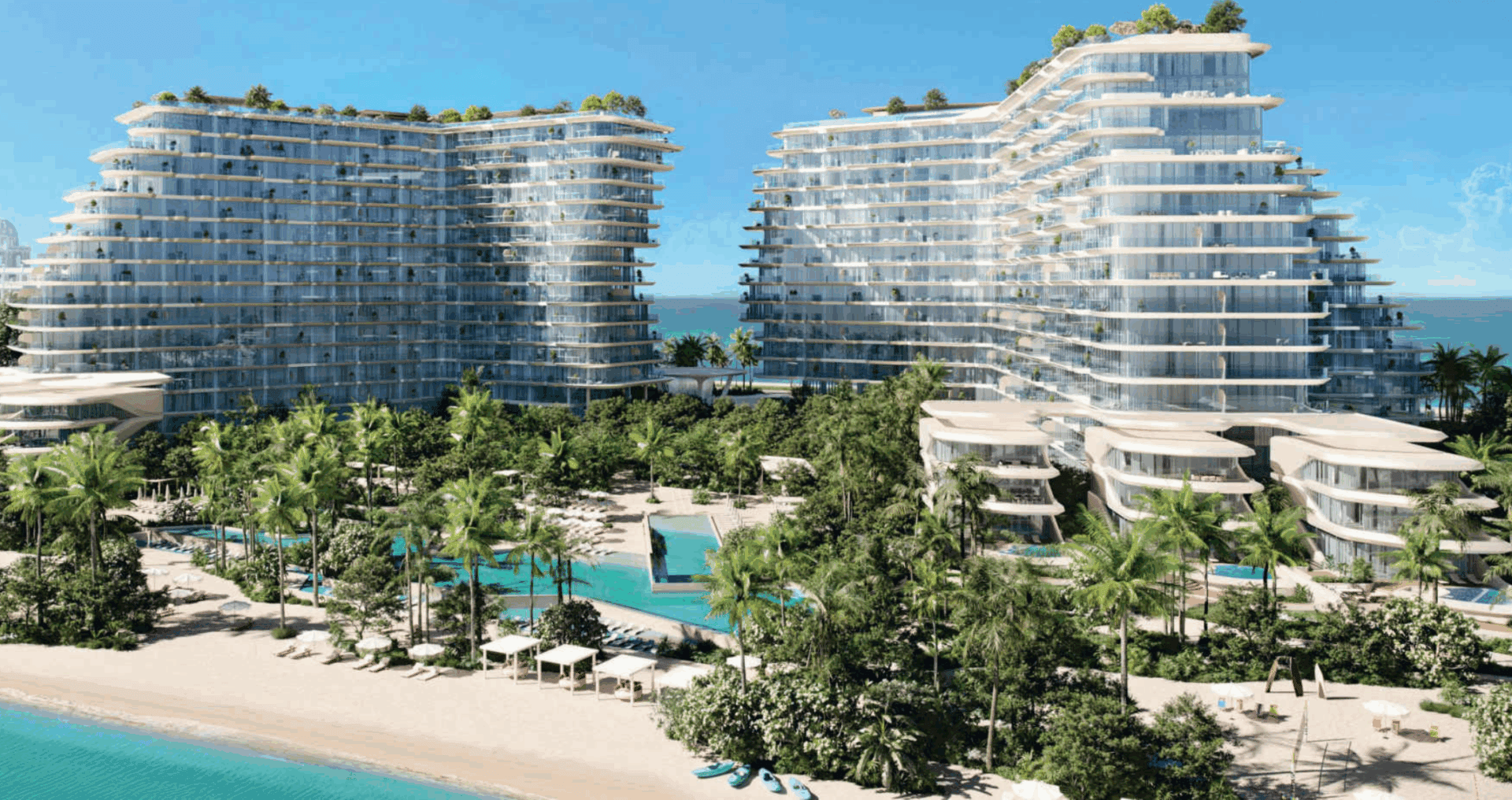 - Zwei ikonisch geschwungene Türme mit 625 Residenzen, darunter 1–4 Schlafzimmer-Wohnungen, 5 Penthouses und 6 freistehende Beach Mansions