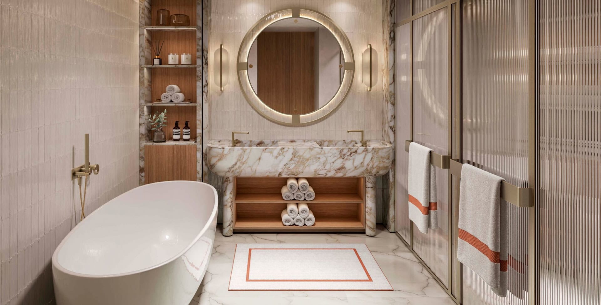 Die Innenausstattung wurde von 1508 London mit einem Fokus auf feinste Materialien und elegante Zurückhaltung entworfen. Calacatta-Marmor, Messingakzente, maßgefertigte Einbauten und modernste Ausstattung definieren hier eine neue Klasse von Wohnen – warm, luxuriös und zeitlos.